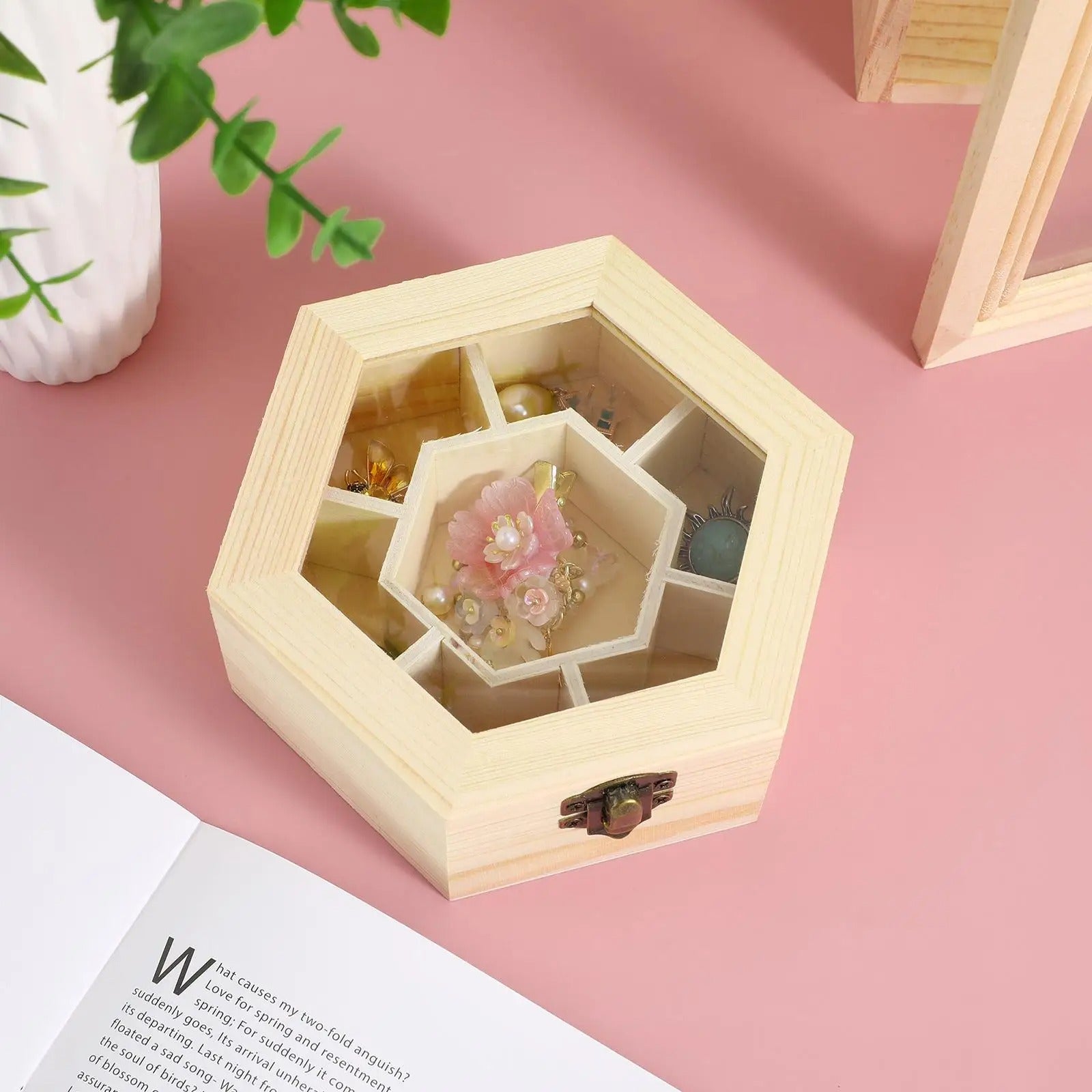 Boîte à bijoux hexagonale en bois clair, idéale pour garder chaque pièce en sécurité et ajouter une touche chaleureuse à votre coiffeuse.