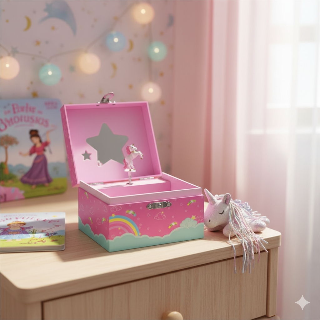 Miroir en forme d’étoile et figurine licorne qui tourne : chaque détail fait briller les yeux des enfants et sécurise leurs bijoux préférés.